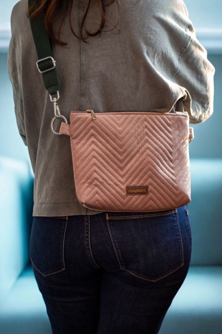 Prosta torebka, kopertówka w średnim rozmiarze wykonana z pikowanego weluru w kolorze pudroworóżowym. Zapinana na suwak.