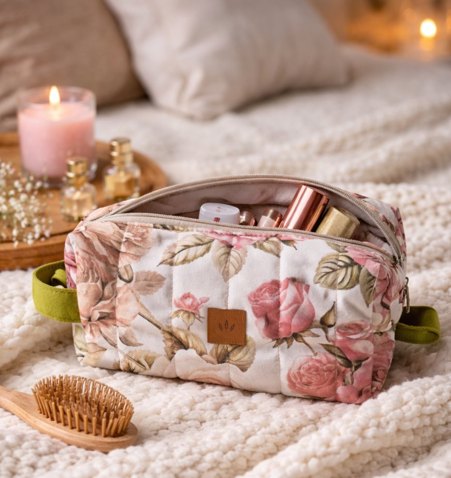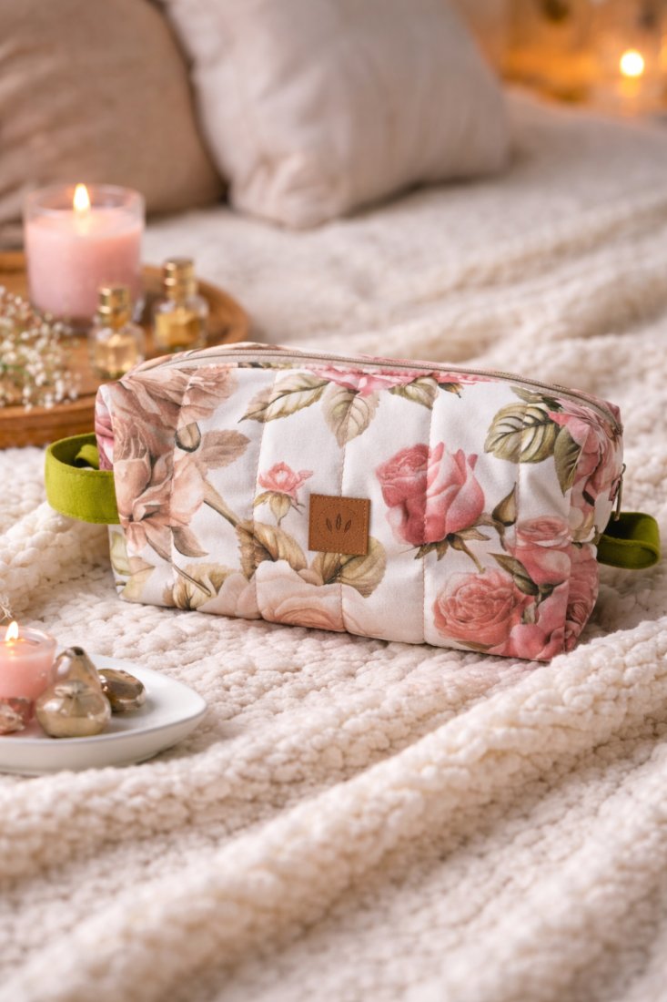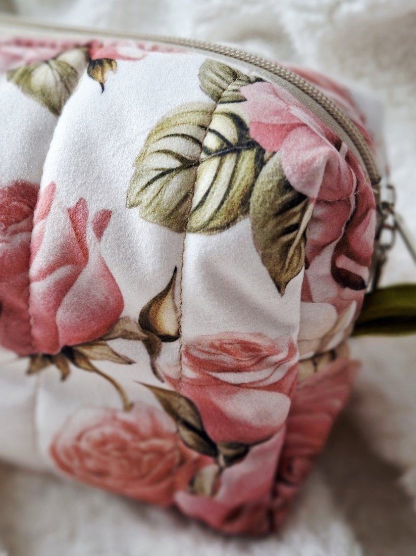 Duża kosmetyczka z weluru w pastelowe róże pikowana na grubej owacie.