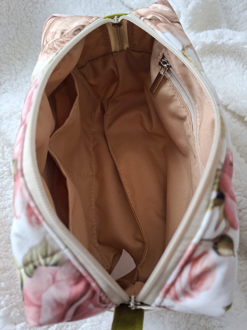 W środku kieszonka na zamek i dwie kieszonki otwarte.