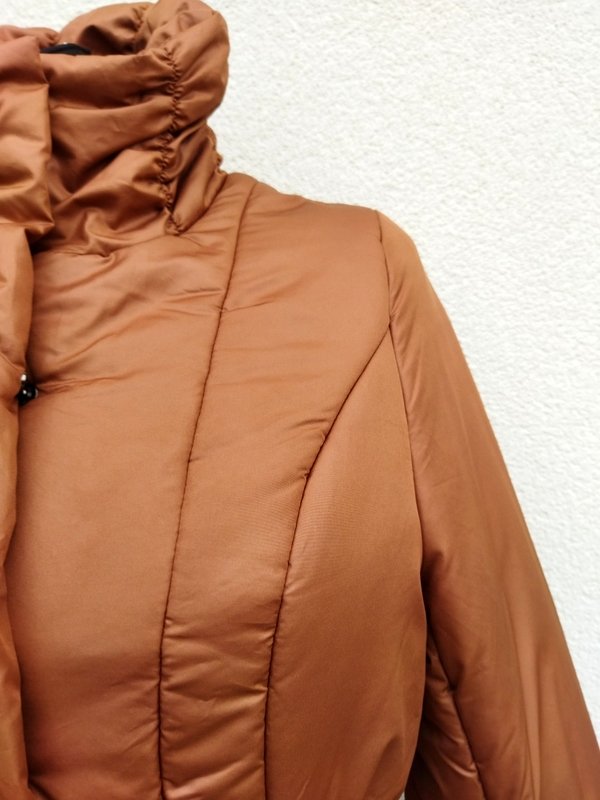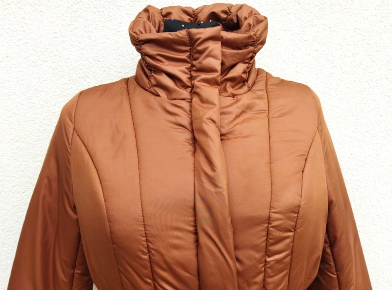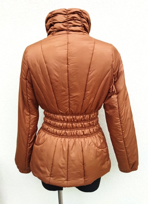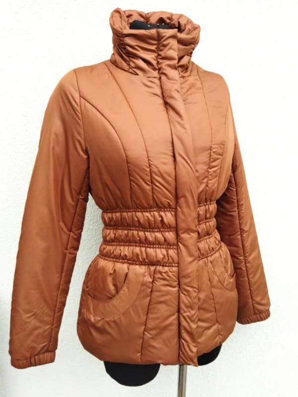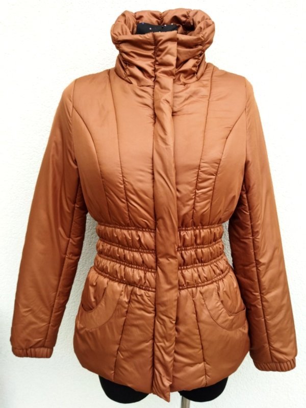 Zgrabna ocieplana pikowana kurtka z poliestrowej tkaniny w koniakowym kolorze, wypełnienie sztuczne. Z drapowanym kołnierzem typu wyższa stójka i drapowana talią , z dwiema wpuszczanymi kieszeniami. Zapinana na zamek ukryty pod plisą zapinana na napy. Całość na podszewce.