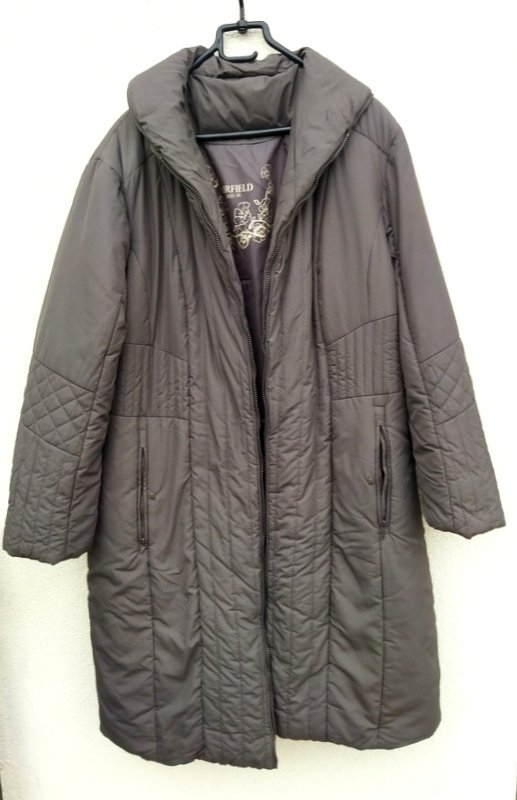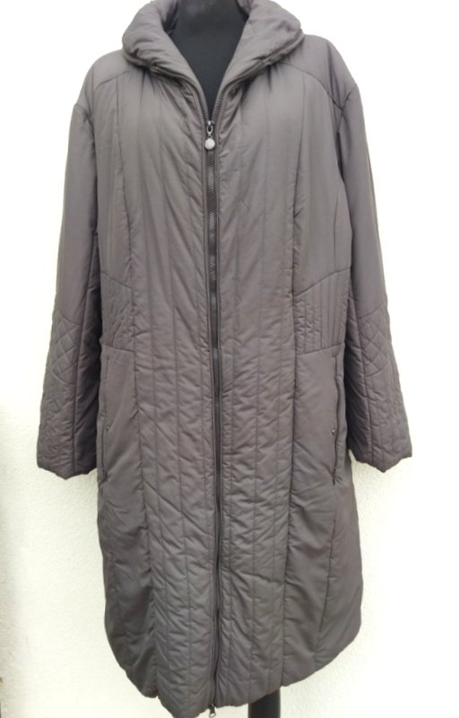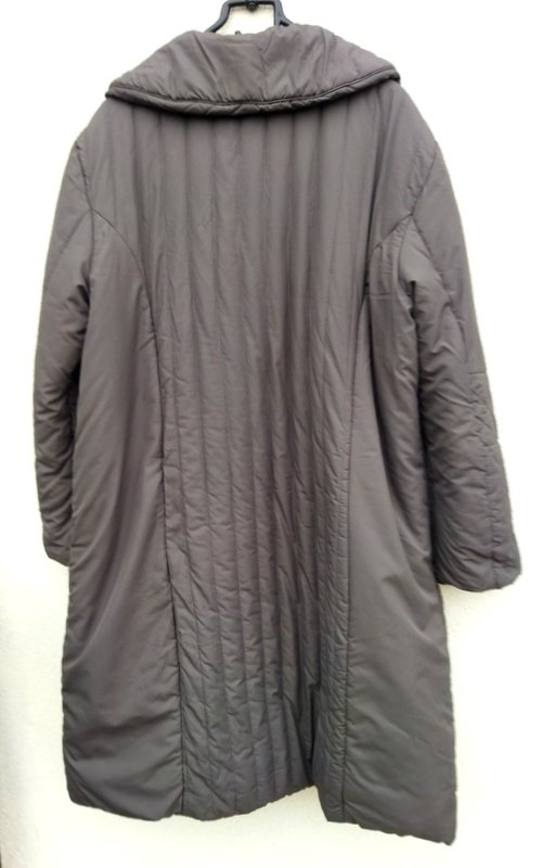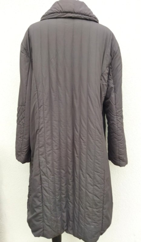 Ocieplany pikowany płaszcz z poliestrowej tkaniny w kolorze rozwodnionej ciemnej zieleni. Zapinany na zamek, dwie wpuszczane kieszenie z zamkami. Całośc na podszewce.