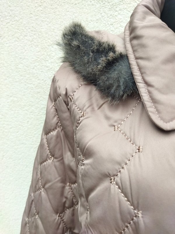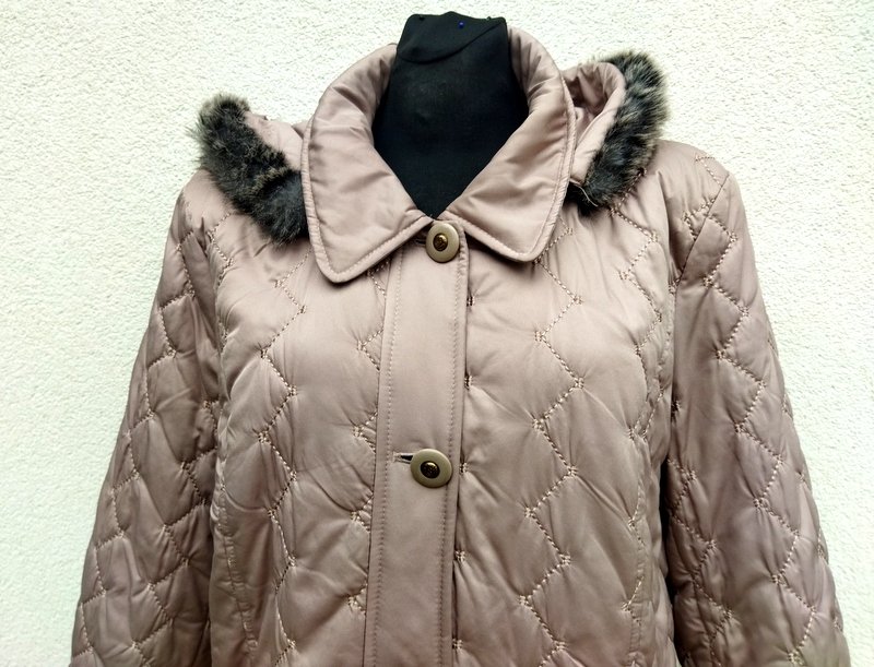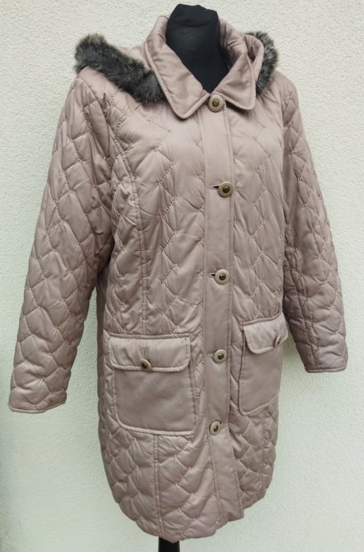 Lekko ocieplany ozdobnie pikowany płaszcz z miłej tkaniny poliestrowej w beżowym kolorze. Z kołnierzem , z dopinanym kapturem obszytym futerkiem z dwiema naszywanymi kieszeniami z patkami zapinanymi na guziki. Zapinany na ozdobne guziki. Całość na podszewce. Wygodny i niezwykle lekki