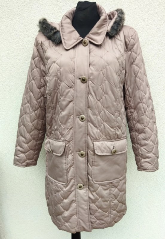 Lekko ocieplany ozdobnie pikowany płaszcz z miłej tkaniny poliestrowej w beżowym kolorze. Z kołnierzem , z dopinanym kapturem obszytym futerkiem z dwiema naszywanymi kieszeniami z patkami zapinanymi na guziki. Zapinany na ozdobne guziki. Całość na podszewce. Wygodny i niezwykle lekki
