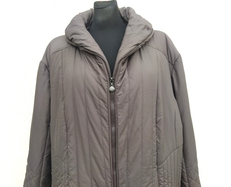 Ocieplany pikowany płaszcz z poliestrowej tkaniny w kolorze rozwodnionej ciemnej zieleni. Zapinany na zamek, dwie wpuszczane kieszenie z zamkami. Całośc na podszewce.