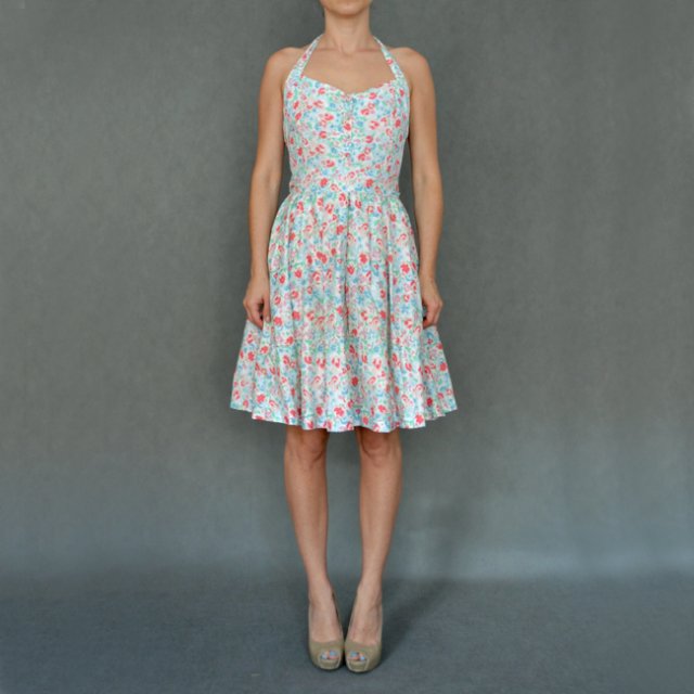 Sukienka marki PIMKIE w stylu lat 50. W kolorowe, drobne kwiatuszki. Dół rozkloszowany. Góra dopasowana z wiązanymi ramiączkami.