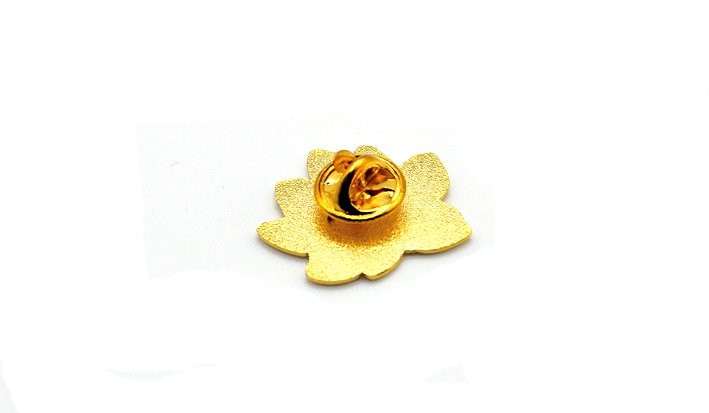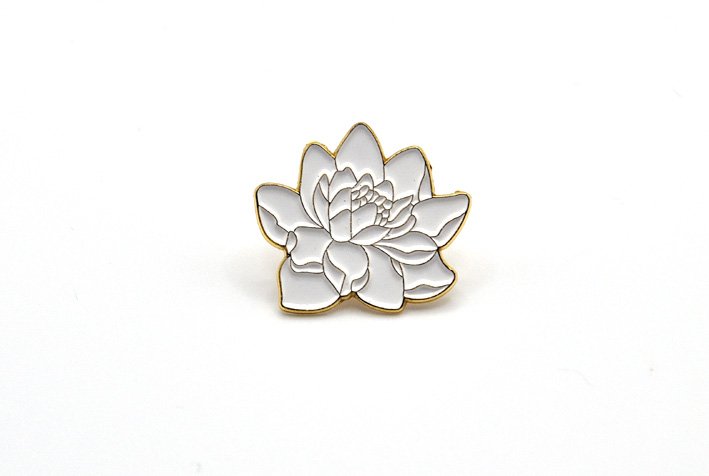 Broszka - pin wykonana ze złotego metalu, pokrytego białą emalią. Przedstawia delikatny kwiat lotosu.