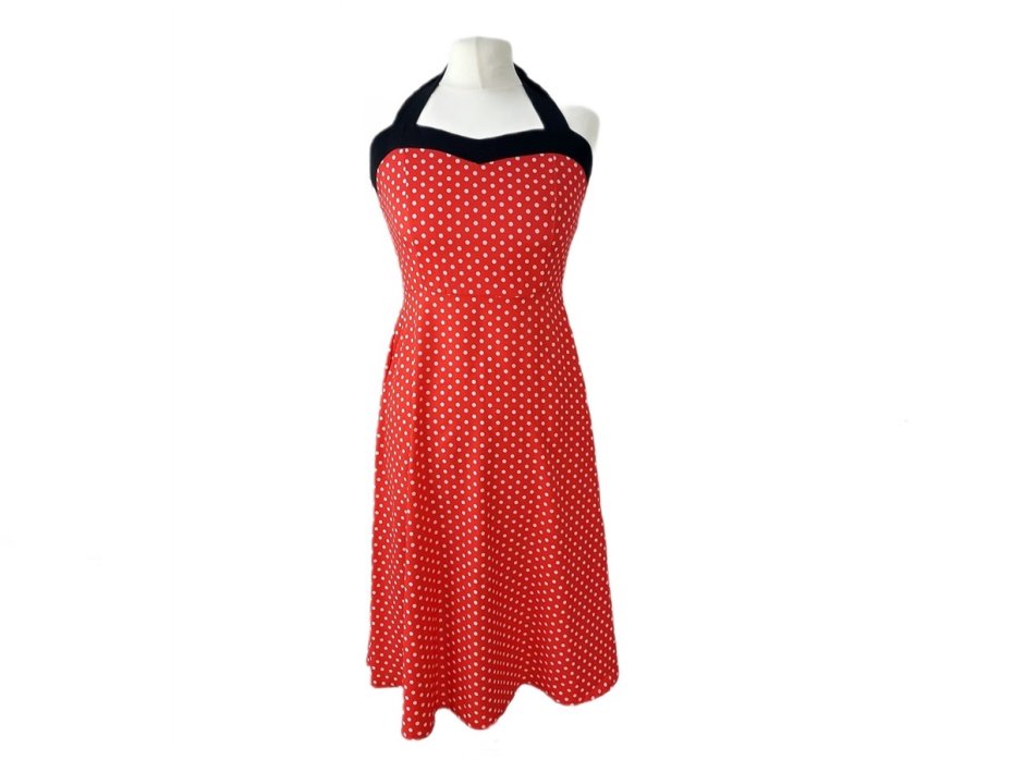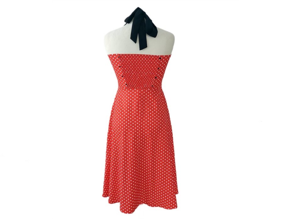 Sukienka w stylu pin-up. Rozkloszowana od talii w dół. Z tyłu gumeczki pozwalające na dopasowanie się sukienki do sylwetki. Wiązanie na szyi.