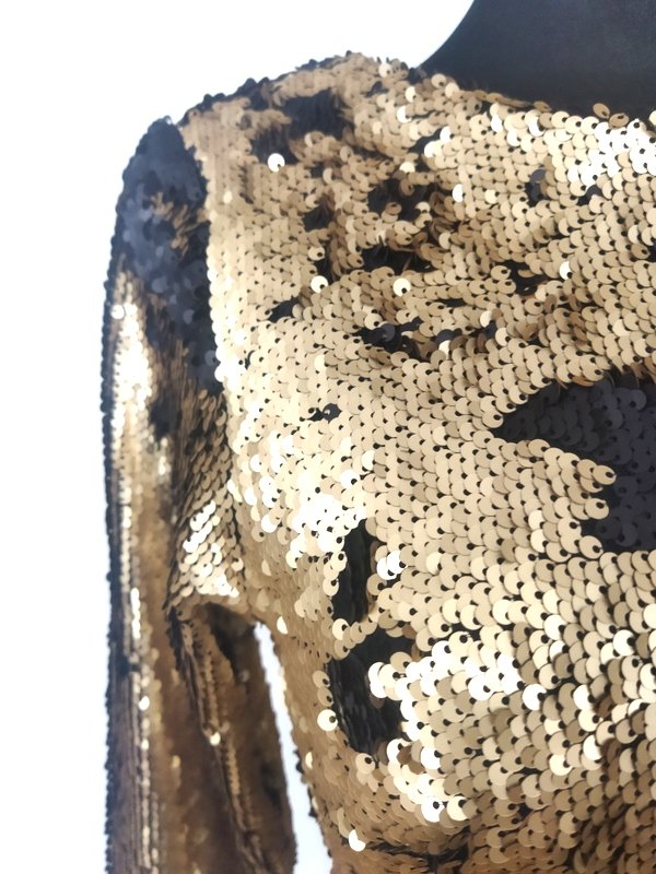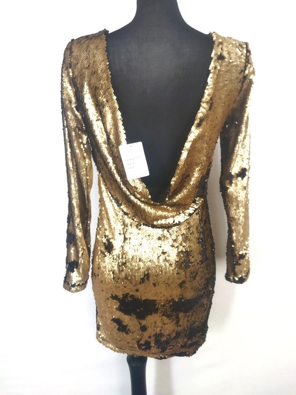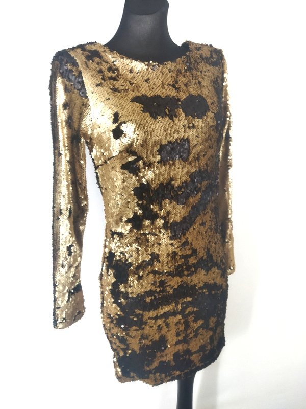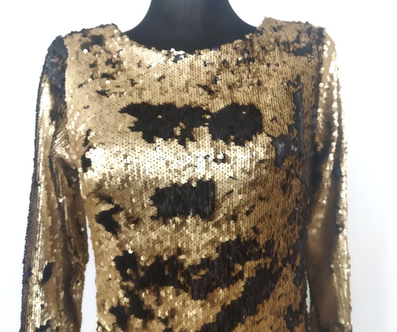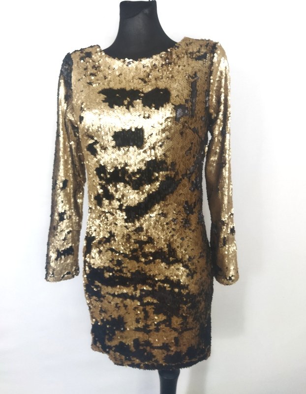 Wyjściowa sukienka z ruchomych cekinów w złotym kolorze z czarnym spodem - można ja nosić na 3 sposoby w całości w złotym kolorze, czarnym lub mieszanym złoto-czarnym . Dopasowana blisko ciała z zabudowanym przodem i głębokim zwodowanym dekoltem z tyłu. Na rozciągliwej dzianinowej czarnej podszewce.