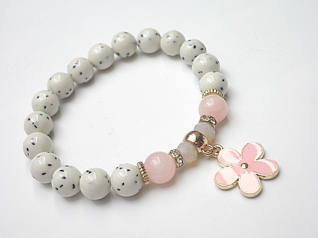 Bransoletka wykonana z naturalnych kamieni - jadeity [10mm] , marmur [10mm], kryształków fasetowanych [6 x 8mm] oraz z elementów metalowych w kolorze tzw. różowego złota. Bransoletka na gumce silikonowej. Będzie pasowała na nadgarstek 16-17cm. Biżuteria ozdobnie zapakowana