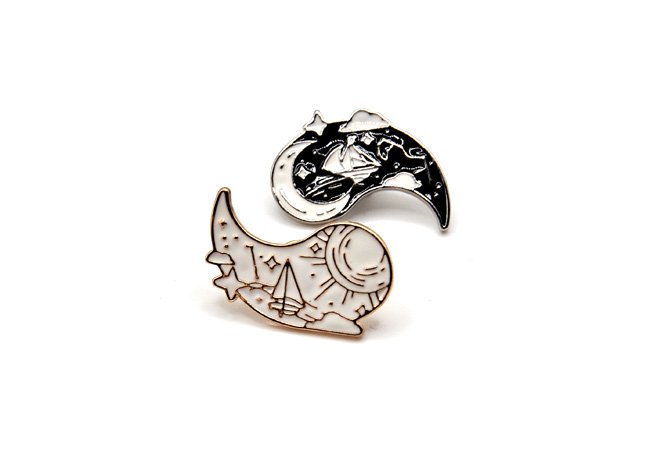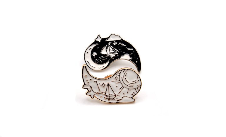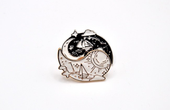 Para broszek - pinów, wykonana ze srebrnego i złotego metalu. Przedstawiają części: nocną (księżyc, gwiazdy, konstelacja, żaglowiec) oraz dzienną (słońce i żaglówka) żeglugę. Pokryte białą i czarną emalią. Można je spiąć razem (ułożą się wtedy w coś na kształt koła) lub nosić osobno.