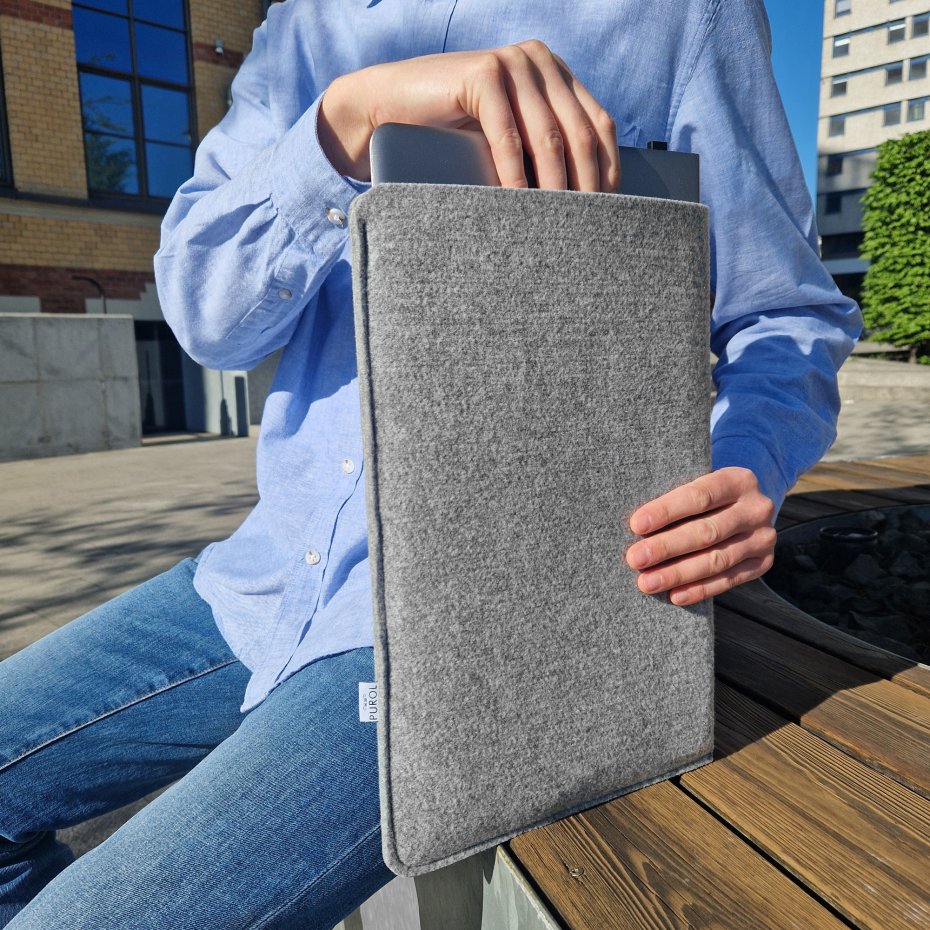 Pionowy pokrowiec z jasnoszarego filcu na laptopa.