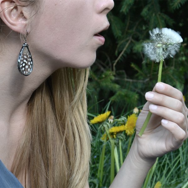 Duże, piękne, szklane kolczyki z piórkami zamkniętymi w szkle. Rustykalna prosta oprawa w kolorze starego srebra wykonana z miedzi pokrytej ekologiczna cyną. Długość całego kolczyka to ok. 6,5 cm. Biżuteria w 100% wykonana ręcznie, poszczególne sztuki mogą się minimalnie różnić.