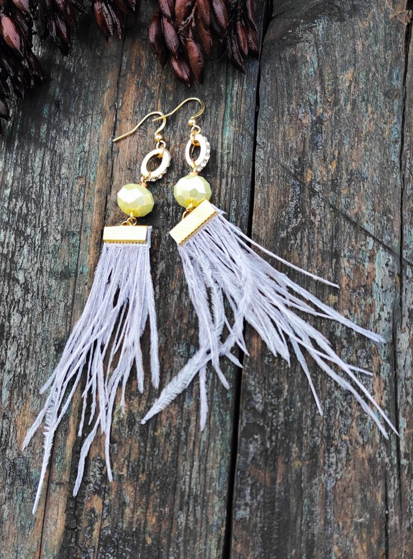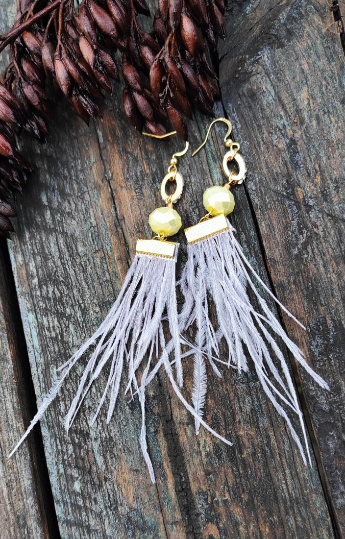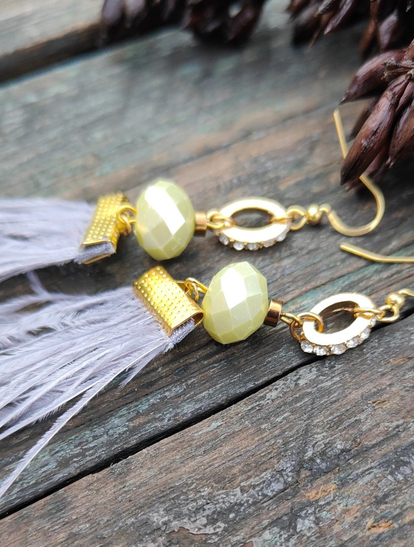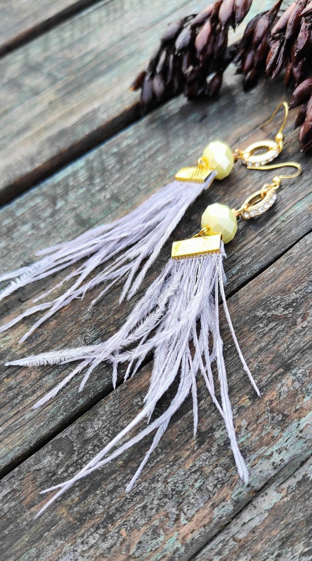 ,, piórka,, to niezwykle urokliwe kolczyki wykonane z pawich piórek w odcinku szarym i dodatków w kolorze złota. Kolczyki zawieszone są na klasycznych biglach w kolorze złotym wykonanych ze stali szlachetnej.