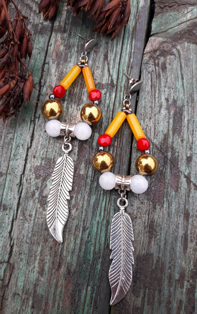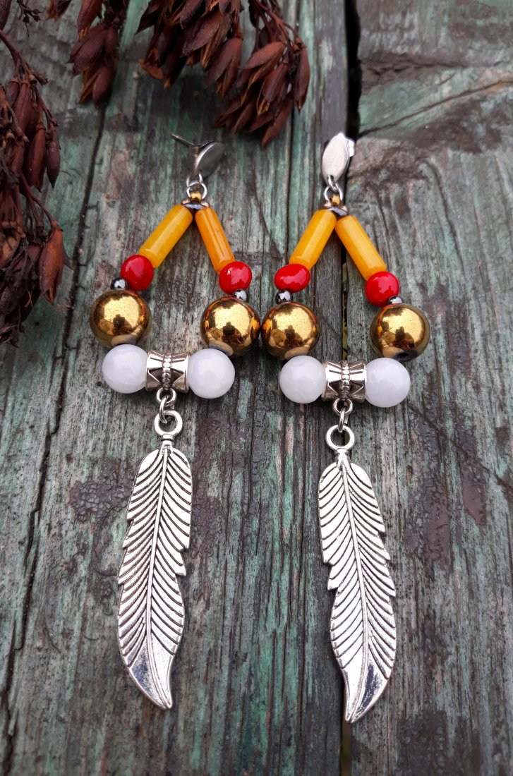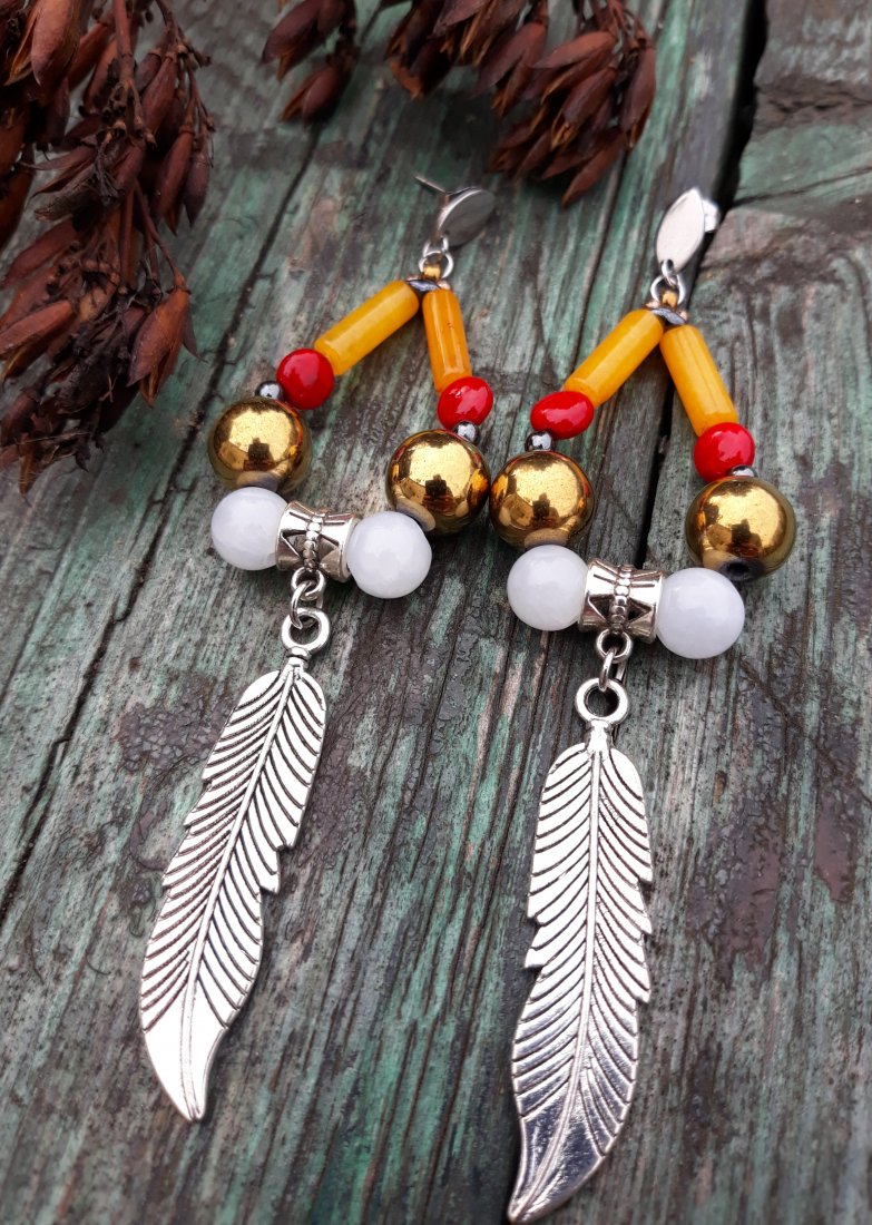 ,,piórko,, to bardzo oryginalne kolczyki wykonane z białego i koralowego jadeitu, złotego i czarnego hematytu, żółtego nefrytu i elementów metalowych. Kolczyki zawieszone są na ozdobnych biglach typu sztyft wykonanych ze stali szlachetnej.