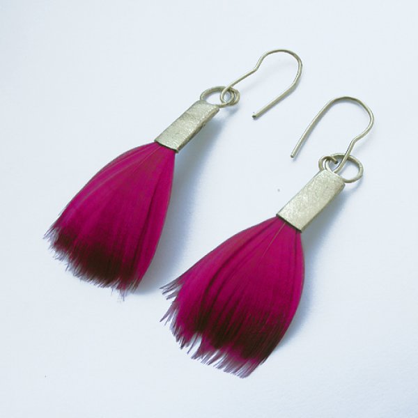 PIÓRKO - stylowy dodatek. Połączenie lekkości piórka i trwałości metalu. Metal niezwykle kontrastuje z naturalnym barwionym puchem. Kolczyki wykonane są z mosiądzu, naturalnie barwione pióra. Mosiądz - zmatowiony. Bigle otwarte - srebro pr.925,pozłacane. Długość z biglami - 7,5 cm. Szerokość - ok. 3 cm. Waga - ok. 2,5 g.