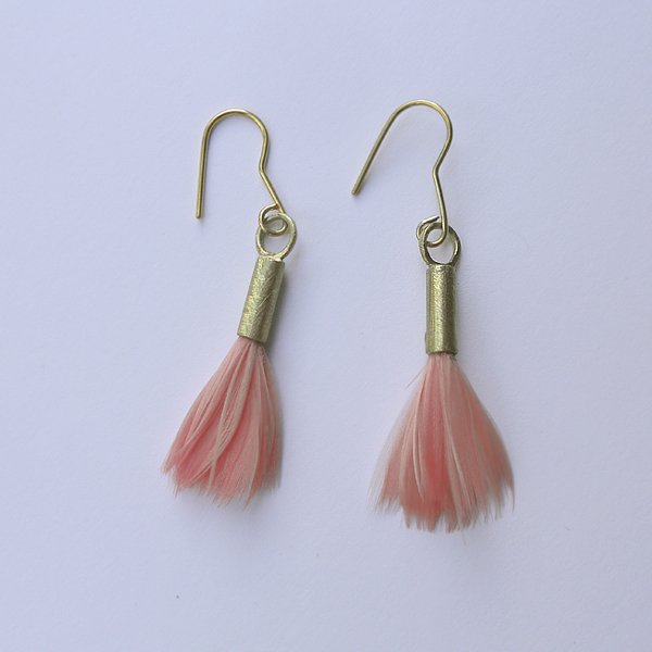 PIÓRKO - stylowy dodatek. Połączenie lekkości piórka i trwałości metalu. Metal niezwykle kontrastuje z naturalnym barwionym puchem. Kolczyki wykonane są z mosiądzu, naturalnie barwione pióra. Mosiądz - zmatowiony. Bigle otwarte - srebro pr.925,pozłacane. Długość z biglami - ok. 5,5cm. Szerokość - 2 cm. Waga - ok. 2,3 g.
