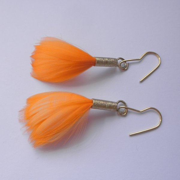 PIÓRKO - stylowy dodatek. Połączenie lekkości piórka i trwałości metalu. Metal niezwykle kontrastuje z naturalnym barwionym puchem. Kolczyki wykonane są z mosiądzu, naturalnie barwione pióra. Mosiądz - zmatowiony. Bigle otwarte - srebro pr.925,pozłacane. Długość z biglami - ok. 5,5cm. Szerokość - 2 cm. Waga - ok. 2,3 g.