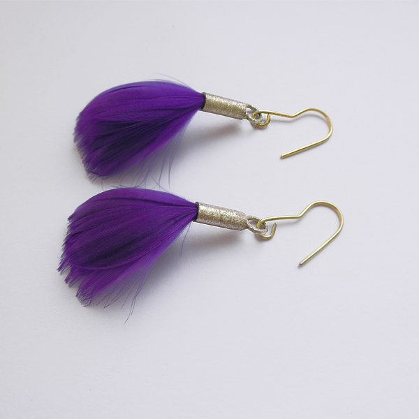 PIÓRKO - stylowy dodatek. Połączenie lekkości piórka i trwałości metalu. Metal niezwykle kontrastuje z naturalnym barwionym puchem. Kolczyki wykonane są z mosiądzu, naturalnie barwione pióra. Mosiądz - zmatowiony. Bigle otwarte - srebro pr.925,pozłacane. Długość z biglami - ok. 5,5cm. Szerokość - 2 cm. Waga - ok. 2,3 g.