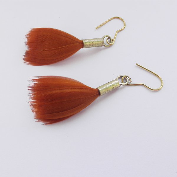 PIÓRKO - stylowy dodatek. Połączenie lekkości piórka i trwałości metalu. Metal niezwykle kontrastuje z naturalnym barwionym puchem. Kolczyki wykonane są z mosiądzu, naturalnie barwione pióra. Mosiądz - zmatowiony. Bigle otwarte - srebro pr.925,pozłacane. Długość z biglami - ok. 5,5cm. Szerokość - 2 cm. Waga - ok. 2,3 g.
