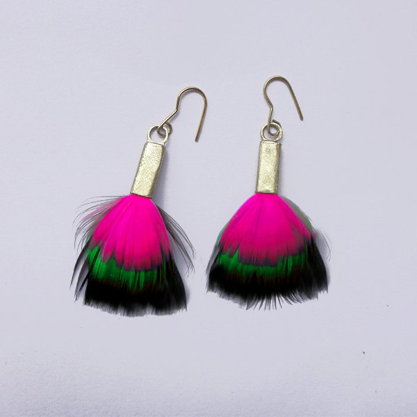PIÓRKO - stylowy dodatek. Połączenie lekkości piórka i trwałości metalu. Metal niezwykle kontrastuje z naturalnym barwionym puchem. Kolczyki wykonane są z mosiądzu, naturalnie barwione pióra. Mosiądz - zmatowiony. Bigle otwarte - srebro pr.925,pozłacane. Długość z biglami - 7,5 cm. Szerokość - ok. 3 cm. Waga - ok. 2,5 g.