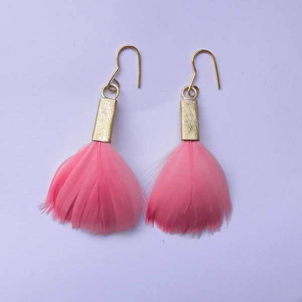 PIÓRKO - stylowy dodatek. Połączenie lekkości piórka i trwałości metalu. Metal niezwykle kontrastuje z naturalnym barwionym puchem. Kolczyki wykonane są z mosiądzu, naturalnie barwione pióra. Mosiądz - zmatowiony. Bigle otwarte - srebro pr.925,pozłacane. Długość z biglami - 7,5 cm. Szerokość - ok. 3 cm. Waga - ok. 2,5 g.