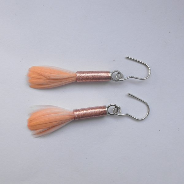 PIÓRKO - stylowy dodatek. Połączenie lekkości piórka i trwałości metalu. Metal niezwykle kontrastuje z naturalnym barwionym puchem. Kolczyki wykonane są z : miedzi, naturalne barwione pióra. Miedź: zmatowiona. Bigle otwarte - srebro pr.925. Długość z biglami - 6 cm. Waga: ok. 3 g