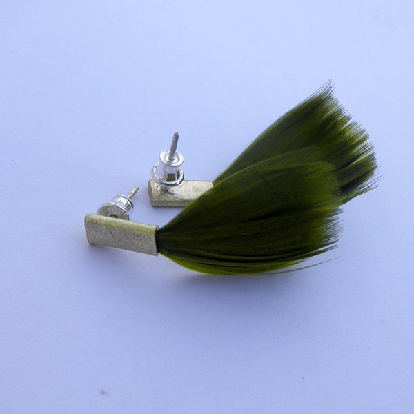 PIÓRKO - stylowy dodatek. Połączenie lekkości piórka i trwałości metalu. Metal niezwykle kontrastuje z naturalnym barwionym puchem.Kolczyki na sztyftach. Kolczyki wykonane są z :mosiądz,srebro- próby 0,925, naturalnie barwione pióra. Mosiądz - zmatowiony. Długość - ok. 3,5cm. Szerokość - 2 cm. Waga - ok. 2 g.