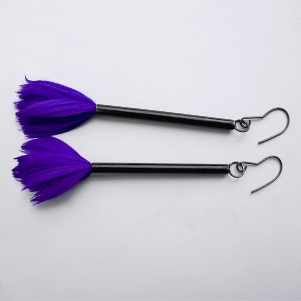 PIÓRKO - stylowy dodatek. Połączenie lekkości piórka i trwałości metalu. Metal niezwykle kontrastuje z naturalnym barwionym puchem. Kolczyki wykonane są z mosiądzu, naturalnie barwione pióra. Mosiądz - zmatowiony, oksydowany. Bigle otwarte - srebro pr.925 oksydowane. Długość z biglami - ok. 9 cm. Szerokość - 2 cm. Waga - ok. 2,8 g.. Termin realizacji zamówienia to 1-2 dni.