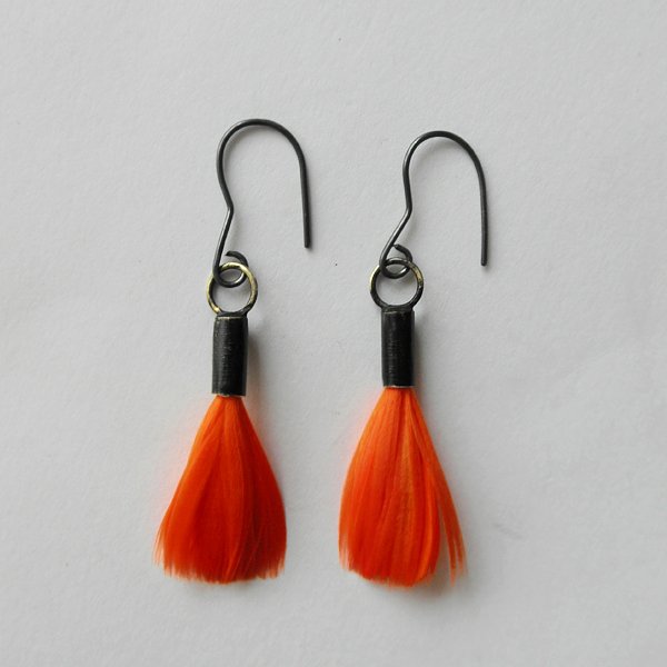 PIÓRKO - stylowy dodatek. Połączenie lekkości piórka i trwałości metalu. Metal niezwykle kontrastuje z naturalnym barwionym puchem. Kolczyki wykonane są z mosiądzu, naturalnie barwione pióra. Mosiądz - oksydowany. Bigle otwarte - srebro pr.925,oksydowane. Długość z biglami - ok. 5,5cm. Szerokość - 2 cm. Waga - ok. 2,3 g.