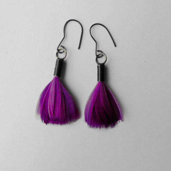 PIÓRKO - stylowy dodatek. Połączenie lekkości piórka i trwałości metalu. Metal niezwykle kontrastuje z naturalnym barwionym puchem. Kolczyki wykonane są z mosiądzu, naturalnie barwione pióra. Mosiądz - oksydowany. Bigle otwarte - srebro pr.925,oksydowane. Długość z biglami - ok. 5,5cm. Szerokość - 2 cm. Waga - ok. 2,3 g.