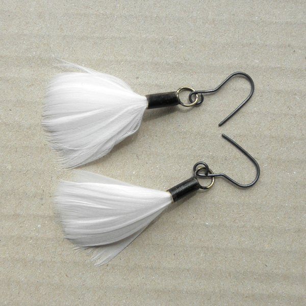 PIÓRKO - stylowy dodatek. Połączenie lekkości piórka i trwałości metalu. Metal niezwykle kontrastuje z naturalnym barwionym puchem. Kolczyki wykonane są z mosiądzu, naturalnie barwione pióra. Mosiądz - oksydowany. Bigle otwarte - srebro pr.925,oksydowane. Długość z biglami - ok. 5,5cm. Szerokość - 2 cm. Waga - ok. 2,3 g.