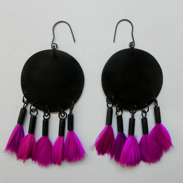 PIÓRKO - stylowy dodatek. Połączenie lekkości piórka i trwałości metalu. Metal niezwykle kontrastuje z naturalnym barwionym puchem. Kolczyki wykonane są z mosiądzu, naturalnie barwione pióra. Mosiądz - zmatowiony, poksydowany. Bigle otwarte - srebro pr.925,oksydowane. Długość z biglami - ok. 10 cm. Szerokość - 4,7 cm.