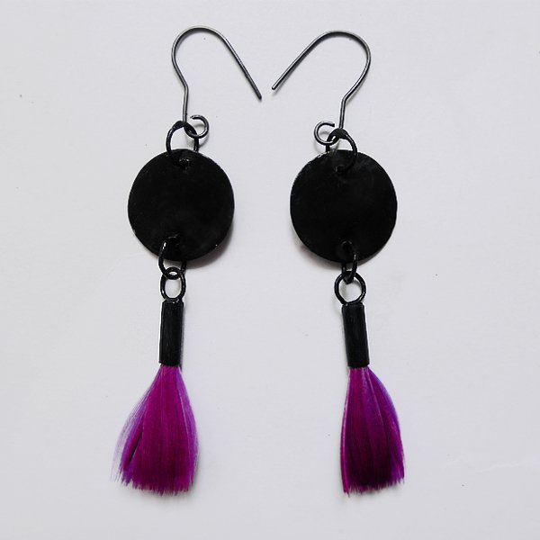PIÓRKO - stylowy dodatek. Połączenie lekkości piórka i trwałości metalu. Metal niezwykle kontrastuje z naturalnym barwionym puchem. Kolczyki wykonane są z mosiądzu, naturalnie barwione pióra. Mosiądz - oksydowany. Bigle otwarte - srebro pr.925,oksydowane. Długość z biglami - ok. 7,5 cm. Szerokość - 2,2 cm.