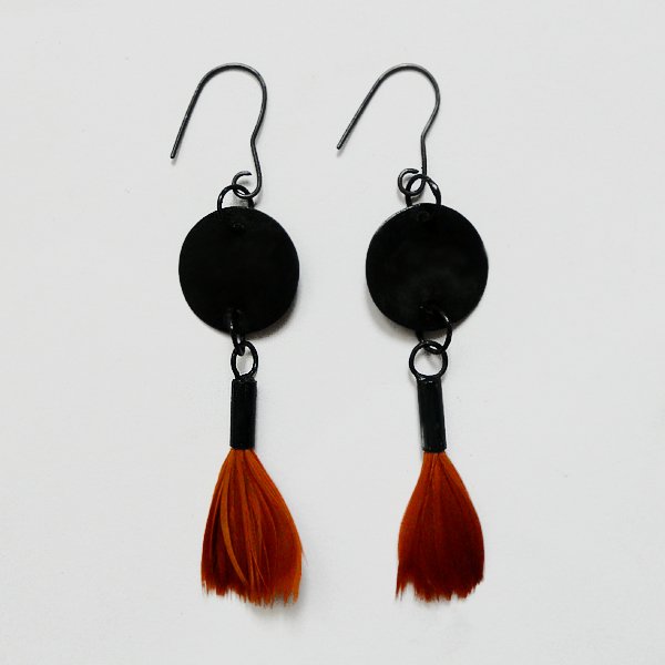 PIÓRKO - stylowy dodatek. Połączenie lekkości piórka i trwałości metalu. Metal niezwykle kontrastuje z naturalnym barwionym puchem. Kolczyki wykonane są z mosiądzu, naturalnie barwione pióra. Mosiądz - oksydowany. Bigle otwarte - srebro pr.925,oksydowane. Długość z biglami - ok. 7,5 cm. Szerokość - 2,2 cm.