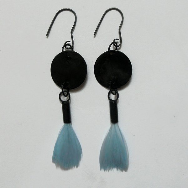 PIÓRKO - stylowy dodatek. Połączenie lekkości piórka i trwałości metalu. Metal niezwykle kontrastuje z naturalnym barwionym puchem. Kolczyki wykonane są z mosiądzu, naturalnie barwione pióra. Mosiądz - oksydowany. Bigle otwarte - srebro pr.925,oksydowane. Długość z biglami - ok. 7,5 cm. Szerokość - 2,2 cm.