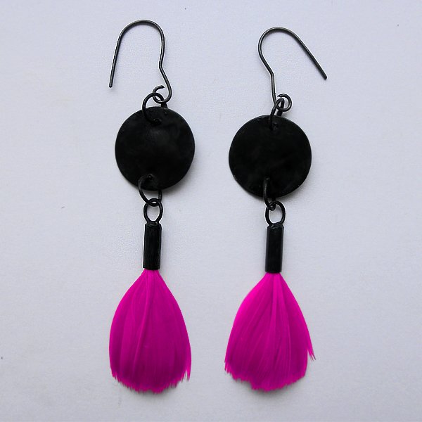 PIÓRKO - stylowy dodatek. Połączenie lekkości piórka i trwałości metalu. Metal niezwykle kontrastuje z naturalnym barwionym puchem. Kolczyki wykonane są z mosiądzu, naturalnie barwione pióra. Mosiądz - oksydowany. Bigle otwarte - srebro pr.925,oksydowane. Długość z biglami - ok. 7,5 cm. Szerokość - 2,2 cm.