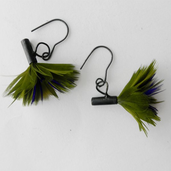 PIÓRKO - stylowy dodatek. Połączenie lekkości piórka i trwałości metalu. Metal niezwykle kontrastuje z naturalnym barwionym puchem. Kolczyki wykonane są z mosiądzu, naturalnie barwione pióra. Mosiądz - zmatowiony, oksydowany. Bigle otwarte - srebro pr.925,oksydowane. Długość z biglami ok. 3 cm. Szerokość - ok. 3cm.