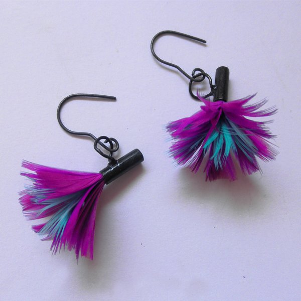 PIÓRKO - stylowy dodatek. Połączenie lekkości piórka i trwałości metalu. Metal niezwykle kontrastuje z naturalnym barwionym puchem. Kolczyki wykonane są z mosiądzu, naturalnie barwione pióra. Mosiądz - zmatowiony, oksydowany. Bigle otwarte - srebro pr.925,oksydowane. Długość z biglami ok. 3 cm. Szerokość - ok. 3cm.
