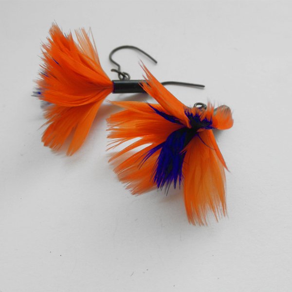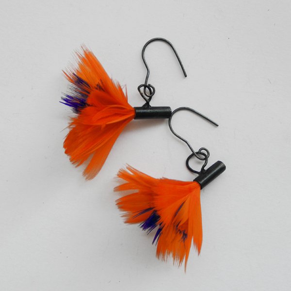 PIÓRKO - stylowy dodatek. Połączenie lekkości piórka i trwałości metalu. Metal niezwykle kontrastuje z naturalnym barwionym puchem. Kolczyki wykonane są z mosiądzu, naturalnie barwione pióra. Mosiądz - zmatowiony, oksydowany. Bigle otwarte - srebro pr.925,oksydowane. Długość z biglami ok. 3 cm. Szerokość - ok. 3cm.