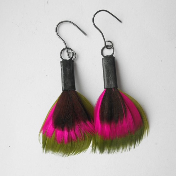 PIÓRKO - stylowy dodatek. Połączenie lekkości piórka i trwałości metalu. Metal niezwykle kontrastuje z naturalnym barwionym puchem. Kolczyki wykonane są z mosiądzu, naturalnie barwione pióra. Mosiądz - oksydowany. Bigle otwarte - srebro pr.925,oksydowane. Długość z biglami - 7,5 cm. Szerokość - ok. 3 cm.