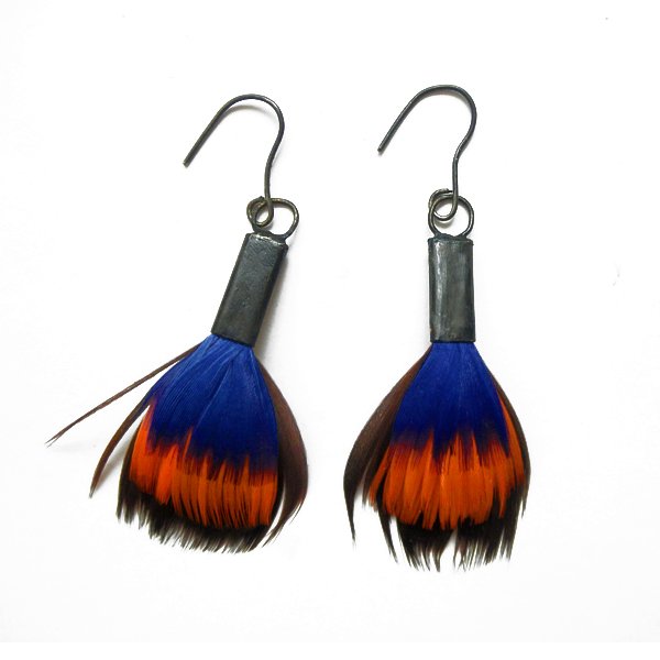 PIÓRKO - stylowy dodatek. Połączenie lekkości piórka i trwałości metalu. Metal niezwykle kontrastuje z naturalnym barwionym puchem. Kolczyki wykonane są z mosiądzu, naturalnie barwione pióra. Mosiądz - oksydowany. Bigle otwarte - srebro pr.925,oksydowane. Długość z biglami - 7,5 cm. Szerokość - ok. 3 cm.