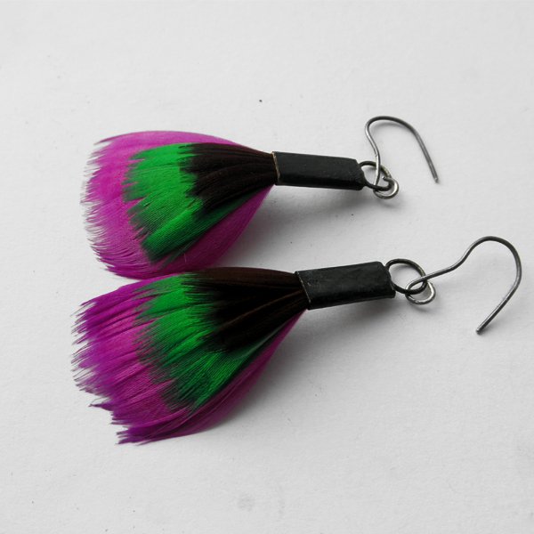 PIÓRKO - stylowy dodatek. Połączenie lekkości piórka i trwałości metalu. Metal niezwykle kontrastuje z naturalnym barwionym puchem. Kolczyki wykonane są z mosiądzu, naturalnie barwione pióra. Mosiądz - oksydowany. Bigle otwarte - srebro pr.925,oksydowane. Długość z biglami - 7,5 cm. Szerokość - ok. 3 cm.