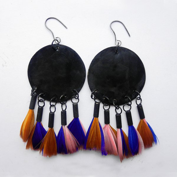 PIÓRKO - stylowy dodatek. Połączenie lekkości piórka i trwałości metalu. Metal niezwykle kontrastuje z naturalnym barwionym puchem. Kolczyki wykonane są z mosiądzu, naturalnie barwione pióra. Mosiądz - zmatowiony, poksydowany. Bigle otwarte - srebro pr.925,oksydowane. Długość z biglami - ok. 10 cm. Szerokość - 4,7 cm.