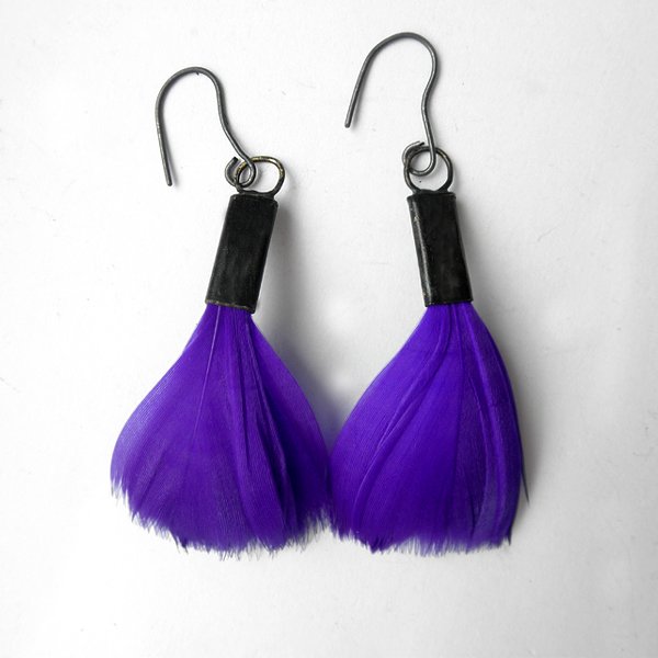 PIÓRKO - stylowy dodatek. Połączenie lekkości piórka i trwałości metalu. Metal niezwykle kontrastuje z naturalnym barwionym puchem. Kolczyki wykonane są z mosiądzu, naturalnie barwione pióra. Mosiądz - oksydowany. Bigle otwarte - srebro pr.925,oksydowane. Długość z biglami - 7,5 cm. Szerokość - ok. 3 cm.