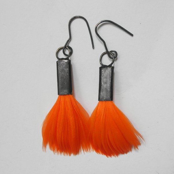 PIÓRKO - stylowy dodatek. Połączenie lekkości piórka i trwałości metalu. Metal niezwykle kontrastuje z naturalnym barwionym puchem. Kolczyki wykonane są z mosiądzu, naturalnie barwione pióra. Mosiądz - oksydowany. Bigle otwarte - srebro pr.925,oksydowane. Długość z biglami - 7,5 cm. Szerokość - ok. 3 cm.