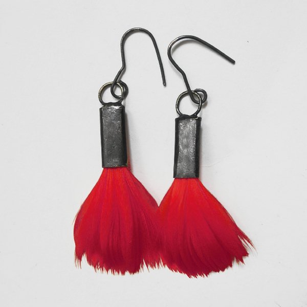 PIÓRKO - stylowy dodatek. Połączenie lekkości piórka i trwałości metalu. Metal niezwykle kontrastuje z naturalnym barwionym puchem. Kolczyki wykonane są z mosiądzu, naturalnie barwione pióra. Mosiądz - oksydowany. Bigle otwarte - srebro pr.925,oksydowane. Długość z biglami - 7,5 cm. Szerokość - ok. 3 cm.
