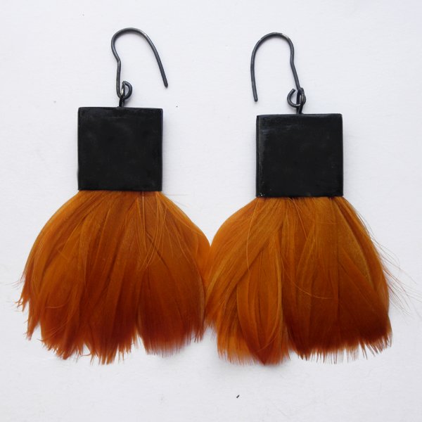 PIÓRKO - stylowy dodatek. Połączenie lekkości piórka i trwałości metalu. Metal niezwykle kontrastuje z naturalnym barwionym puchem. Kolczyki wykonane są z mosiądzu, naturalnie barwione pióra. Mosiądz - zmatowiony, oksydowany. Bigle otwarte - srebro pr.925,oksydowane. Długość z biglami - ok. 10,5 cm. Szerokość - 5,5 cm.