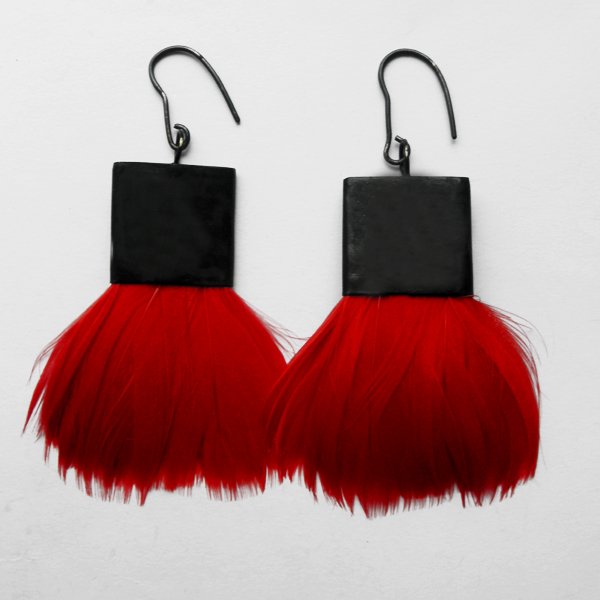 PIÓRKO - stylowy dodatek. Połączenie lekkości piórka i trwałości metalu. Metal niezwykle kontrastuje z naturalnym barwionym puchem. Kolczyki wykonane są z mosiądzu, naturalnie barwione pióra. Mosiądz - zmatowiony, oksydowany. Bigle otwarte - srebro pr.925,oksydowane. Długość z biglami - ok. 10,5 cm. Szerokość - 5,5 cm.