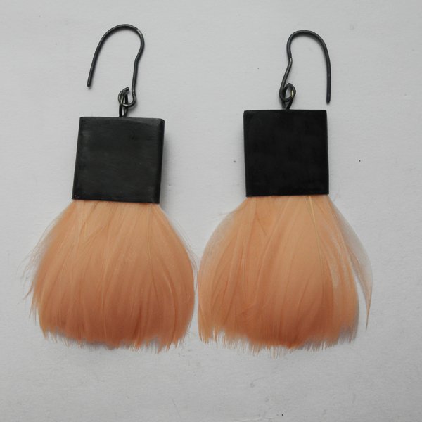 PIÓRKO - stylowy dodatek. Połączenie lekkości piórka i trwałości metalu. Metal niezwykle kontrastuje z naturalnym barwionym puchem. Kolczyki wykonane są z mosiądzu, naturalnie barwione pióra. Mosiądz - zmatowiony, oksydowany. Bigle otwarte - srebro pr.925,oksydowane. Długość z biglami - ok. 10,5 cm. Szerokość - 5,5 cm.