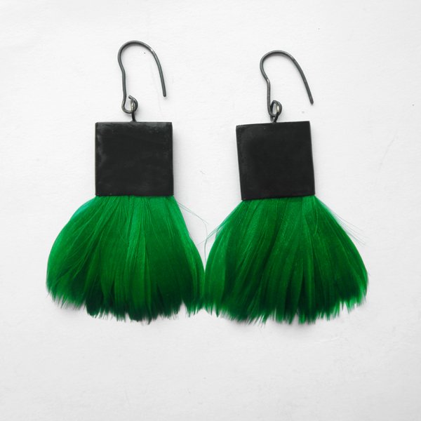 PIÓRKO - stylowy dodatek. Połączenie lekkości piórka i trwałości metalu. Metal niezwykle kontrastuje z naturalnym barwionym puchem. Kolczyki wykonane są z mosiądzu, naturalnie barwione pióra. Mosiądz - zmatowiony, oksydowany. Bigle otwarte - srebro pr.925,oksydowane. Długość z biglami - ok. 10,5 cm. Szerokość - 5,5 cm.